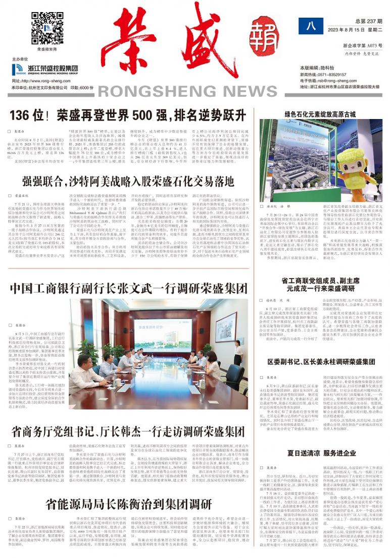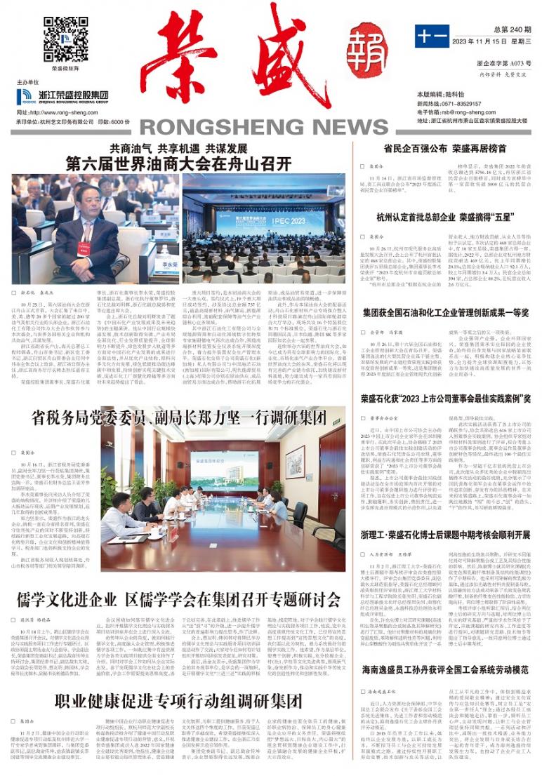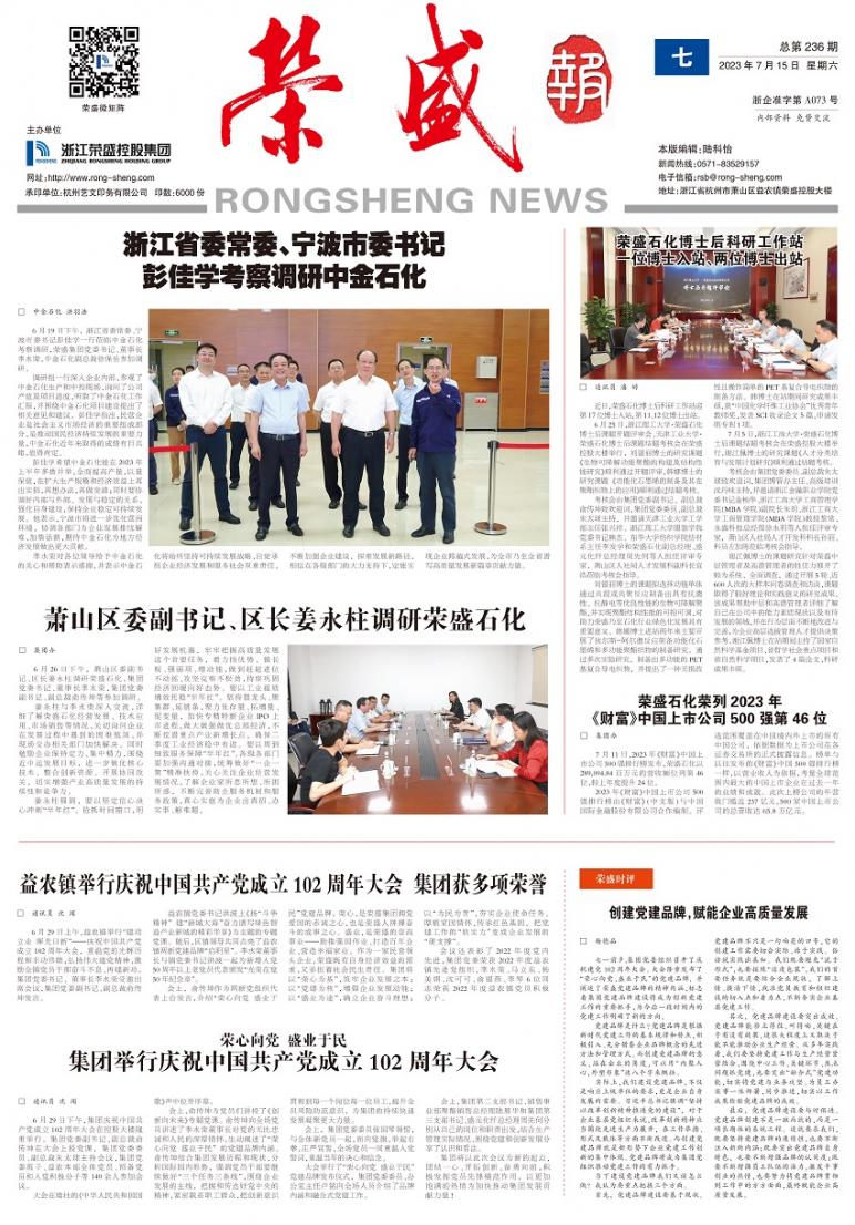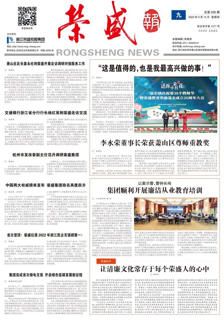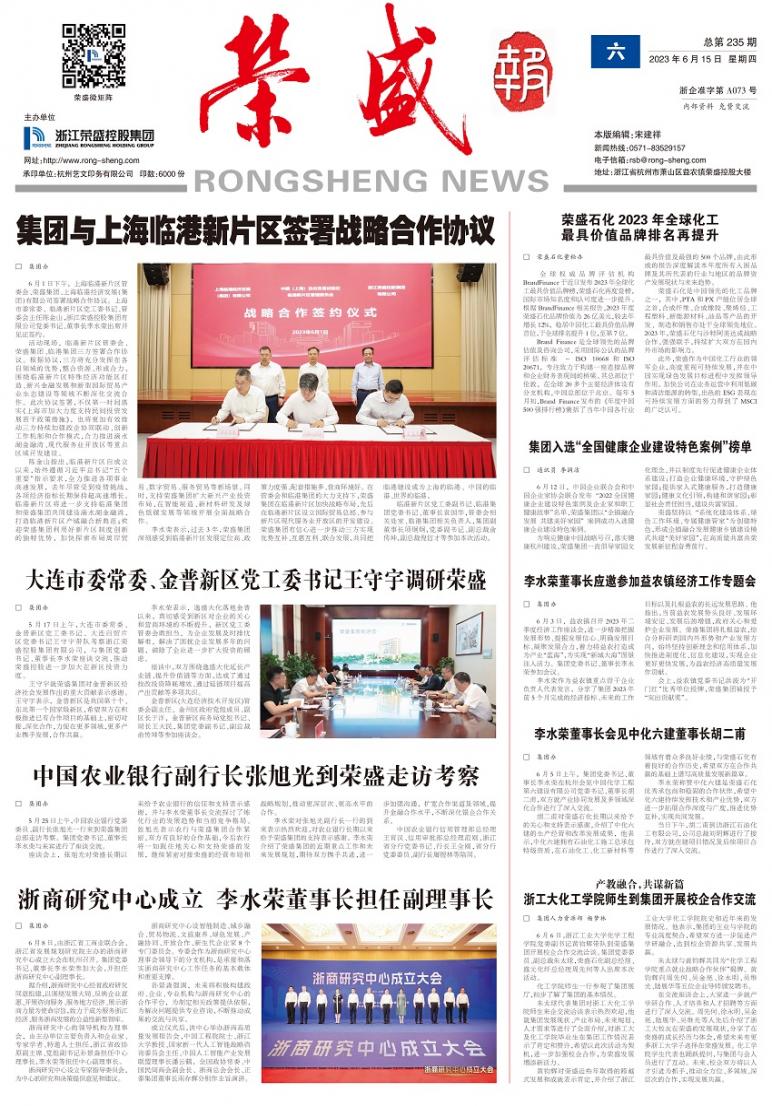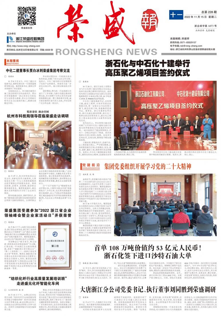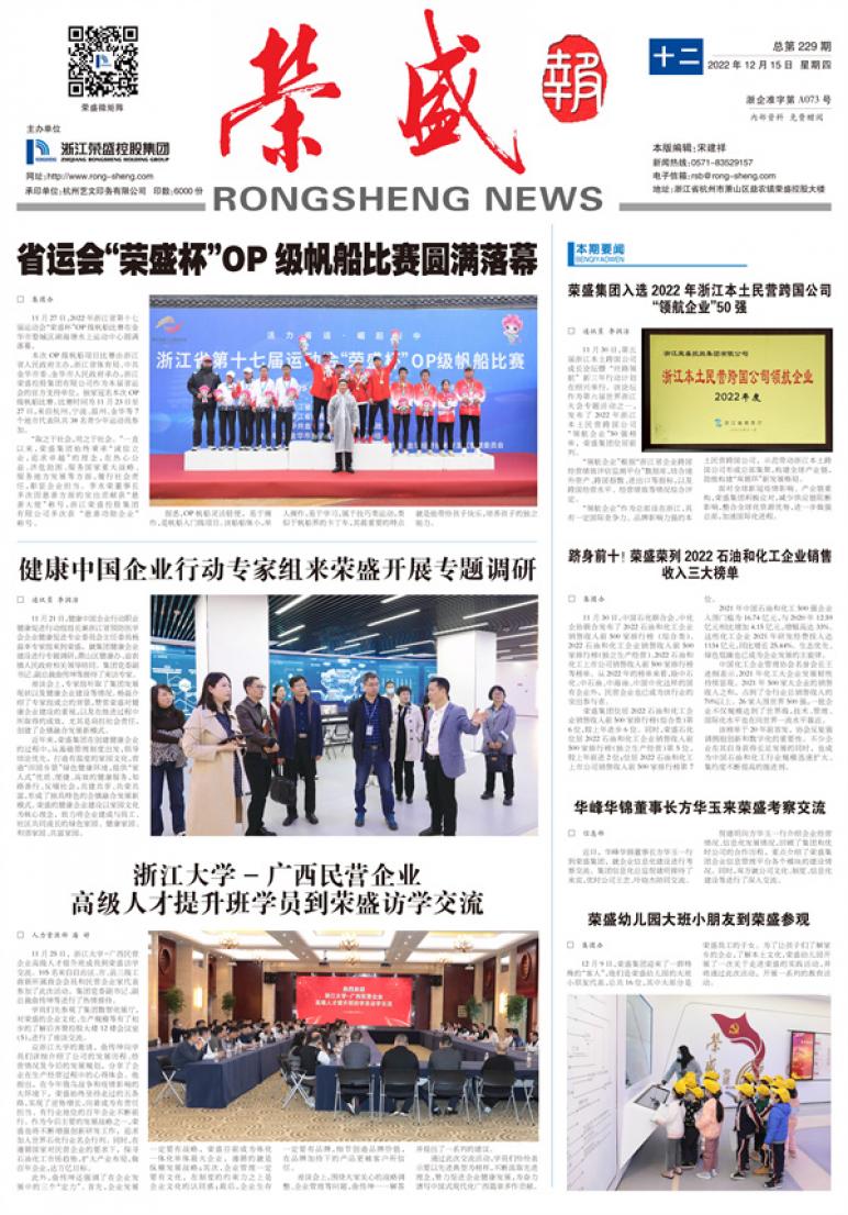 《荣盛报》由浙江荣盛控股集团有限公司主办,为连续性内部资料性出版物,准印证为浙企准字第A073号,全彩对开月报。多年获评“杭州市优秀企业报”和“浙江省优秀企业报”。《荣盛报》秉承“树立企业形象、加强内外部沟通、促进企业文化建设”的办报宗旨,致力于打造健康向上、贴近读者、丰富多彩的荣盛宣传平台。